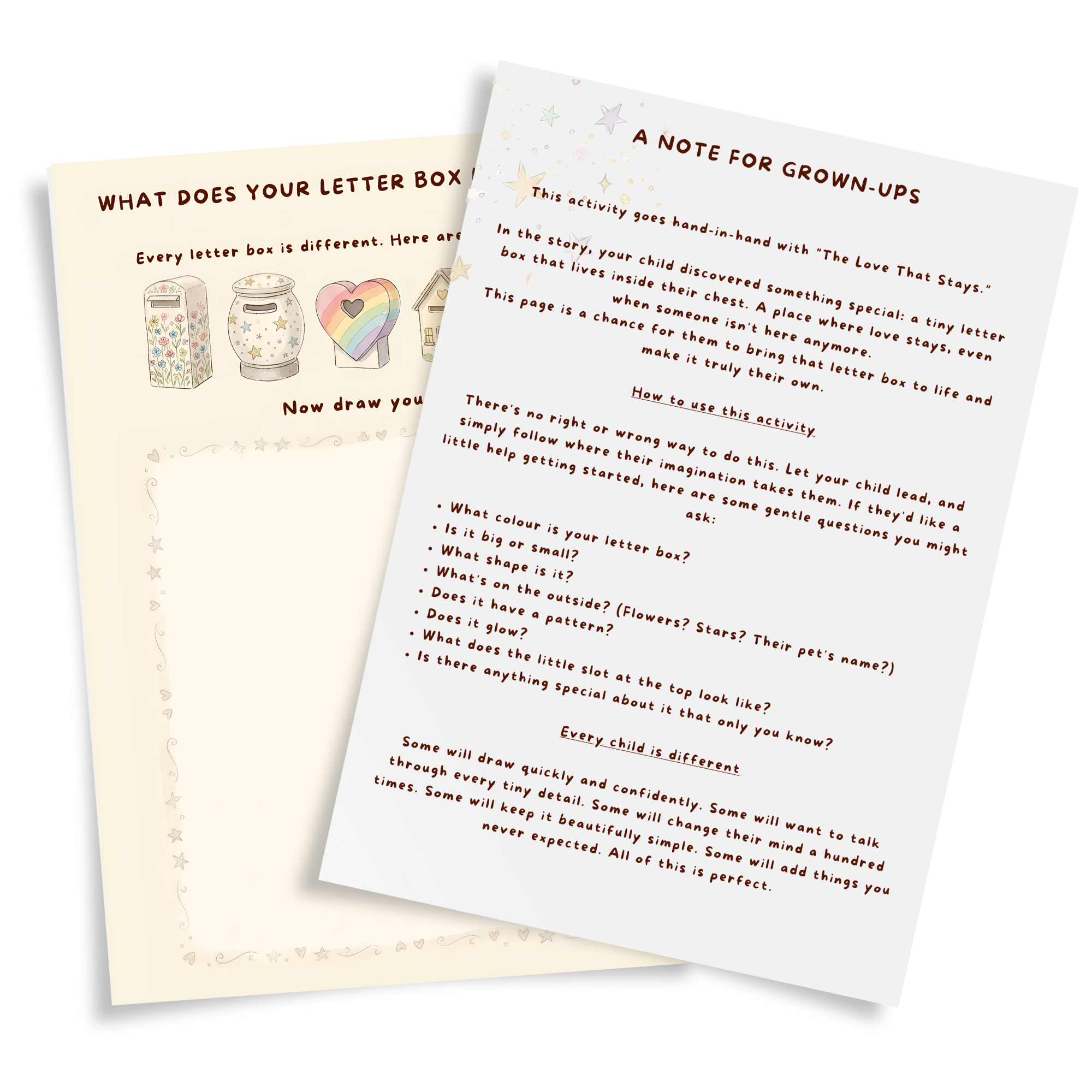 ![]() | Every letter box is different. This activity helps your child imagine theirs. What colour it is, what's on the outside and what makes it special. Includes a notes page for grown-ups. |